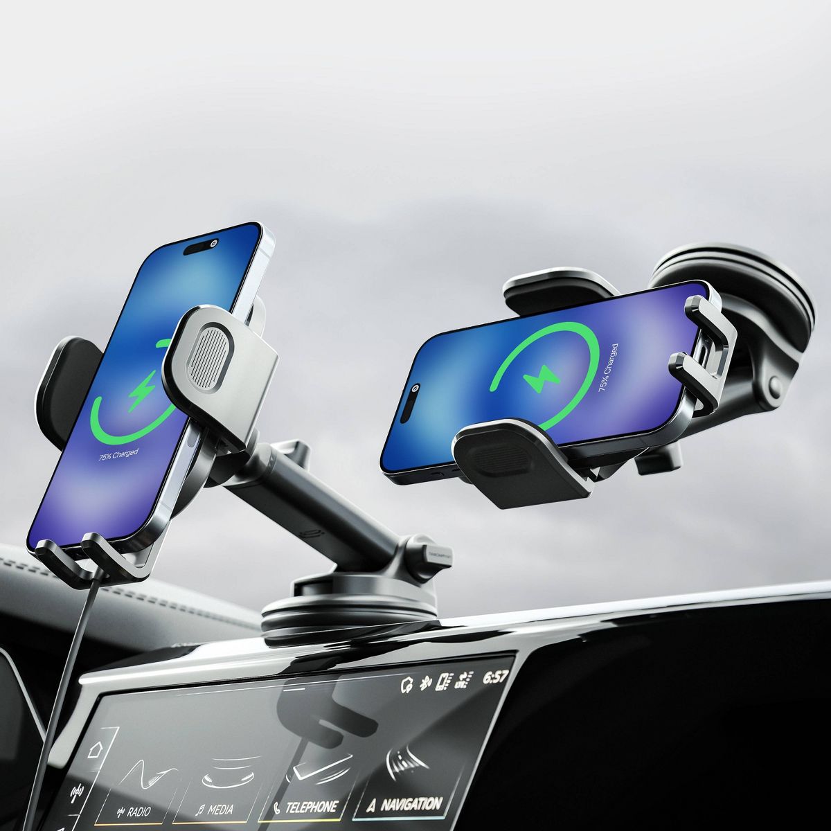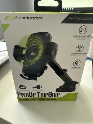The Bracketron PwrUp TripGrip 15W Wireless Charging Window, Dash, Vent Mount. The PwrUp TripGrip is an ideal solution for anyone who has a wireless charging iPhone or Android phone. Place the phone into the adjustable mount and start charging. The bundle includes a 20W PD USB-C car charger and cable as well as a 3M Dash Mount pad for extra security on any uneven dashboards. Also included in the bundle is an optional J-Hook vent mount that is suitable for most AC vent louvers.