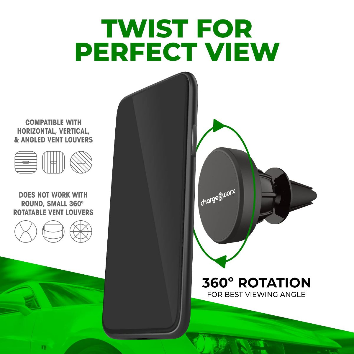 The Chargeworx Magnetic Swivel Air Vent Mount is an innovative, hands-free mounting solution for smartphones and other portable devices. Its powerful magnet instantly secures your phone to the magnet mount with one effortless motion. The mount easily connects to your vent louvers and securely holds multiple types of devices. Hands-free calling, streaming, and navigating couldn't' be easier. Cutting down on distracting multi-tasking while driving is paramount (especially given new hands-free road rules) so we've engineered a super-compact phone holder that you won't have to struggle with. No cumbersome vice or spring grips to mess with here; our magnetic phone mount takes hold of your device as soon as you place it near the compact, round base. The phone stand, with its discreet design, will blend right into your vehicles cabin without getting in the way of your view or instruments. You may then adjust your viewing angle by turning the base on its 360-degree axis. Also included are two different sized plates that you can adhere to any devices that may not be magnet-ready, making them fully compatible with the mount.