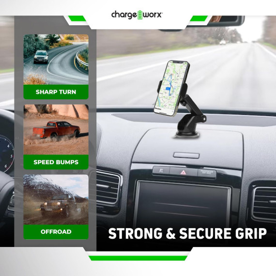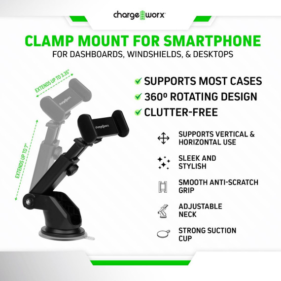 Experience the ultimate in hands-free smartphone utility with our innovative ChargeWorx Suction-Mount Smartphone Holder. Designed with convenience and functionality in mind, this versatile tool offers an array of features that will revolutionize how you interact with your smartphone in your car, at home, or at the office. Fully adjustable design allows you to effortlessly switch between Portrait or Landscape orientation, ensuring a seamless transition between your favorite apps, videos, and navigation tools. Extendable arm provides the flexibility to position your phone exactly where you need it, whether on the dashboard, windshield, or even on your desk. Enjoy unrestricted freedom with 360?ø rotation, enabling you to effortlessly switch between landscape and portrait mode on the go. Experience unmatched convenience as you seamlessly adapt your phone's orientation to meet your changing needs, whether it's for GPS navigation, video calls, or simply catching up on your favorite content. This combination of features ensures you can view your screen at the perfect angle for any situation, whether at home or on the road. Keep your phone safe and secure without compromising functionality. The extra-strong phone grip is engineered with an anti-scratch surface, providing a gentle yet firm hold on your smartphone. Rest assured that your device is safe from unwanted slips and scratches, even during bumpy rides or sudden stops. Installs in seconds on any smooth, flat surface. Powerful suction technology offers a steadfast hold wherever you install the mount, ensuring a strong and reliable attachment, no matter where your adventures take you. Transform the way you multitask with the ChargeWorx Suction Mount Smartphone Holder. Enjoy the convenience of a secure and adjustable grip that always keeps your device accessible and visible. Upgrade your device interaction today and make the most out of every moment with this game-changing accessory.
