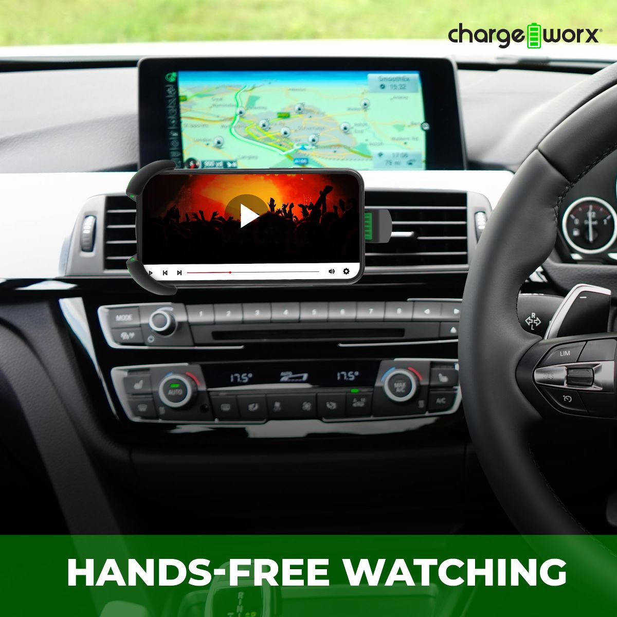 - Universal Use: Chargeworx' deluxe phone mount for car features a luxurious design that will secure almost any smartphone and portable device to your vehicle's ac vents, while leaving virtually all side-controls accessible. The featured Easy Glide button opens a world of smooth operation and extends the frame up to 7-inches.