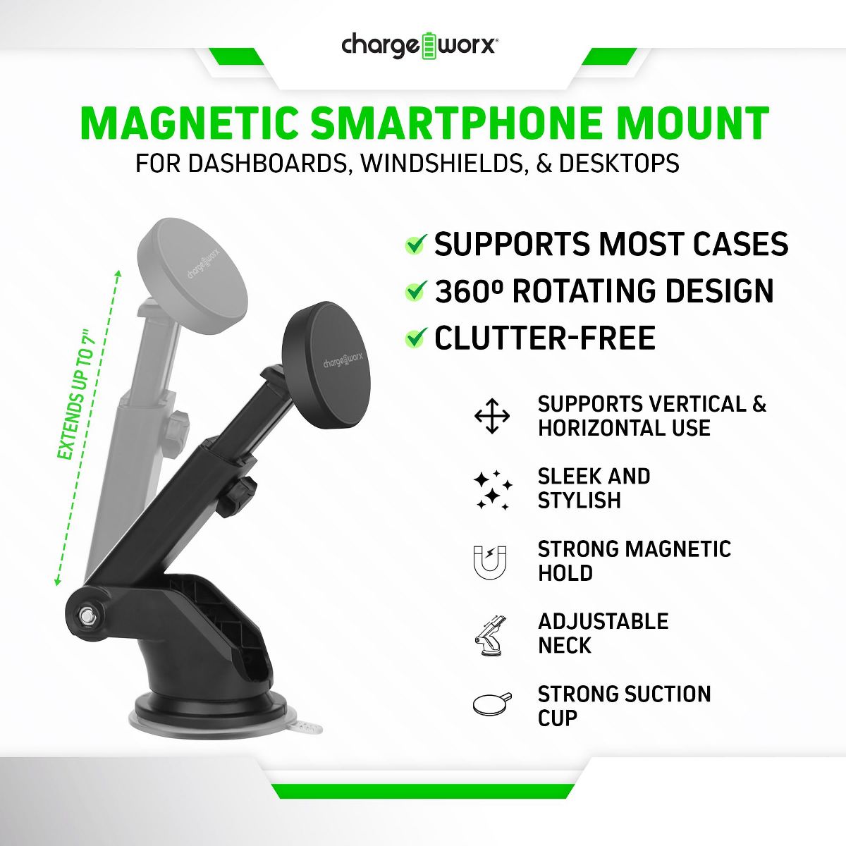 Designed for convenience and reliability, this ChargeWorx smartphone mount offers a powerful and secure magnetic hold, allowing you to keep your phone firmly in place while you navigate, communicate, or enjoy media on the go, while the adjustable neck extends up to 7 inches, providing optimal viewing angles for your comfort. With its strong suction cup, this mount adheres firmly to any smooth surface, whether it's your car's dashboard, your office desk, or even the walls of your home. On top of that, the mount is compatible with most smartphone cases and effortlessly supports both landscape and portrait modes. Even non-magnetic smartphones can benefit from this mount, as the package comes with plates that enable secure attachment! Versatile and reliable, the ChargeWorx Universal Magnetic Smartphone Mount is a must-have accessory for anyone seeking convenience and stability in their daily smartphone usage!