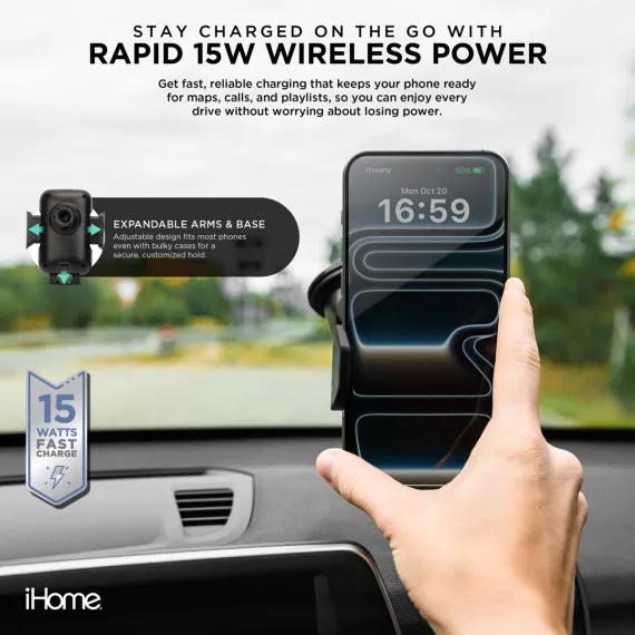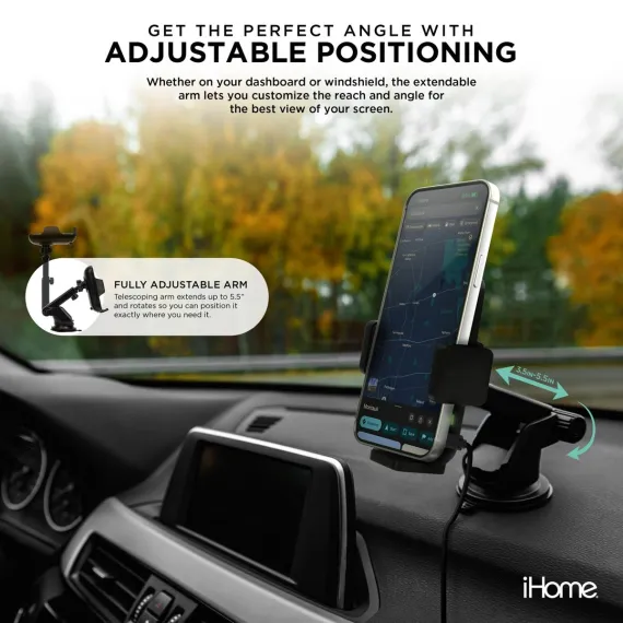 Never worry about running low on battery while you’re on the road again. The iHome Universal Wireless Charging Car Mount is here to keep your phone powered up with fast 15W wireless charging. Simply drop your phone onto the mount, and it will start charging right away, so you can focus on what matters: driving.