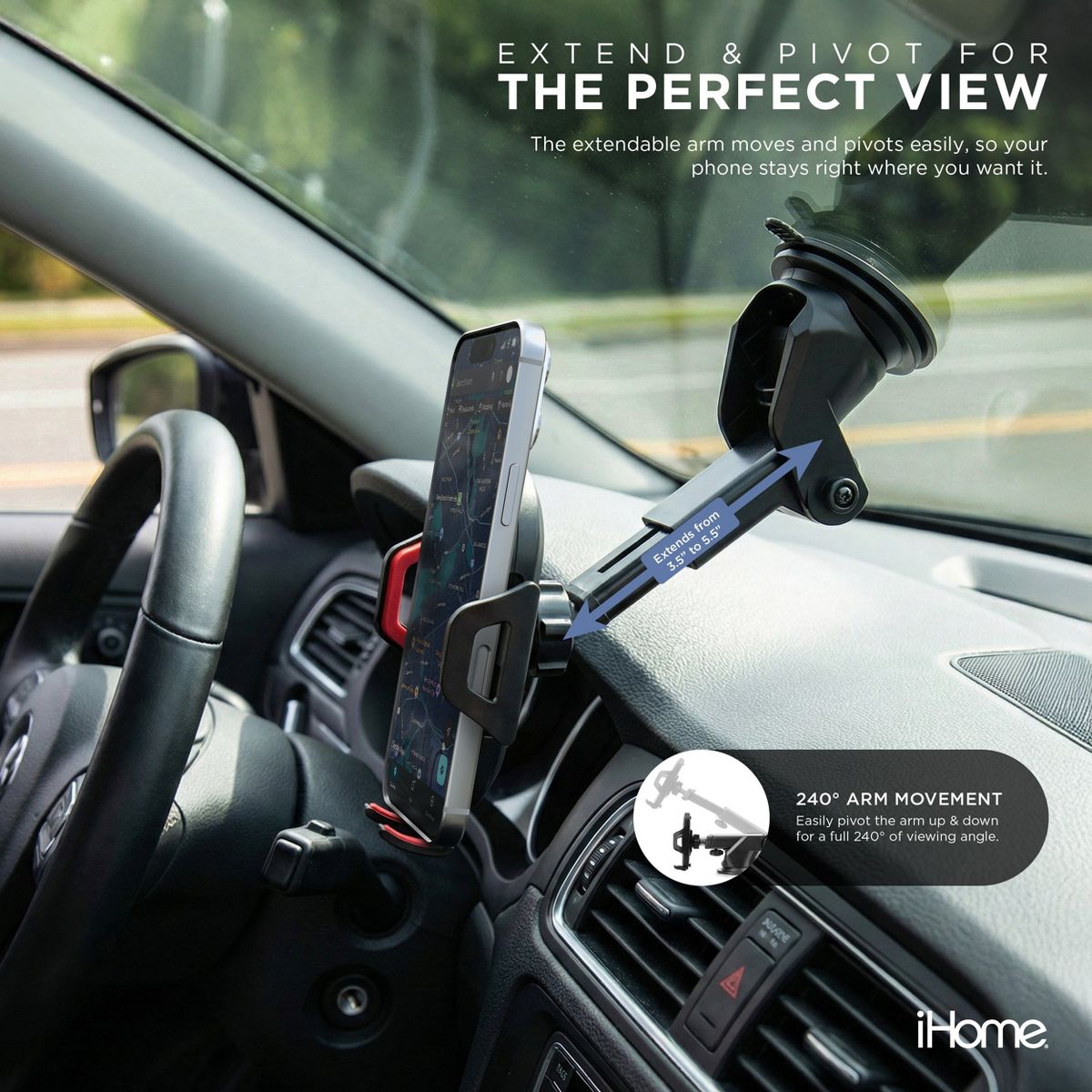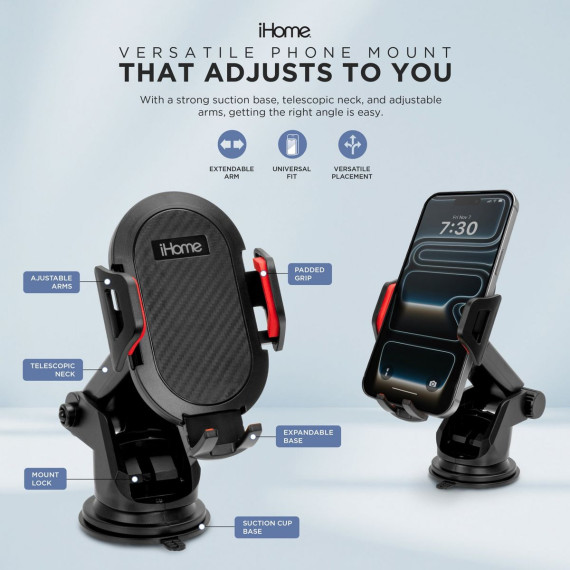 Transform the way you drive with the iHome Extendable Dash Car Mount—your phone’s new co-pilot that keeps navigation, calls, and music right within reach. Whether you’re navigating city streets, taking conference calls on the go, or streaming your favorite playlists, this mount keeps your phone secure and easily accessible. The extendable arm moves from 3.5” to 5.5” and pivots a full 240°, giving you the flexibility to find the perfect viewing angle. No more awkward neck twists or squinting at your screen—your maps and apps are right where you need them. Strong adhesive paired with an additional mount lock ensures your phone stays firmly in place on dashboards or windshields, even over bumps and sharp turns. Mounting or removing your phone has never been simpler. The push release button allows one-handed operation, making it quick and convenient to grab your phone in a hurry. Adjustable arms fit all smartphones, including devices with protective cases, so every driver can enjoy a snug, secure fit. Plus, the mount works on both dashboards and windshields, letting you choose the placement that fits your car and driving style best. Upgrade your drive with a mount that blends practical tech with everyday convenience. Discover a new level of comfort, safety, and accessibility for your phone on the road with the iHome Extendable Dash Car Mount.