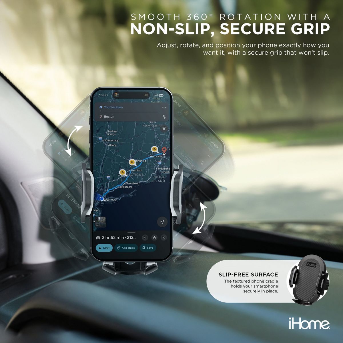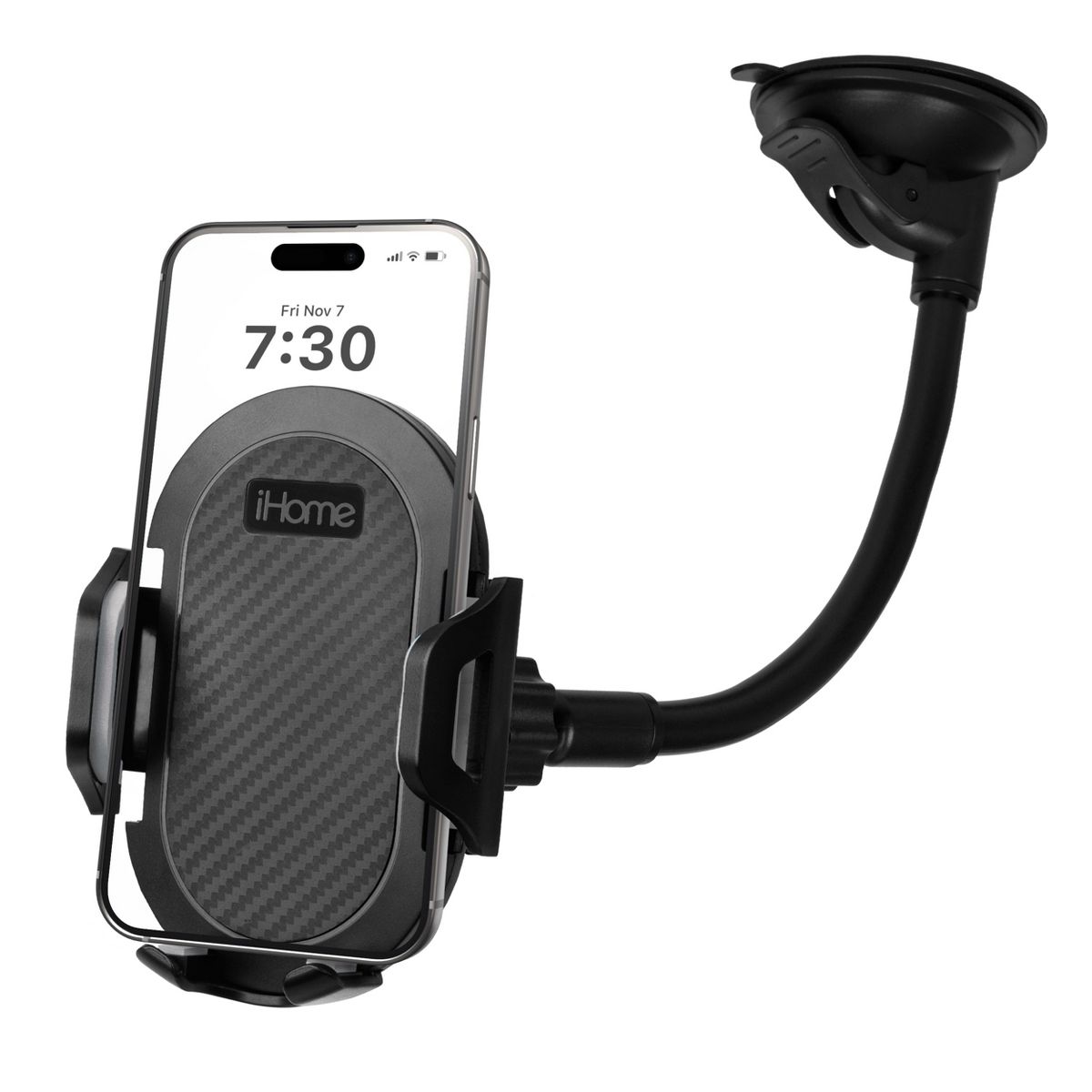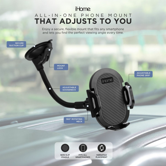 iHome Gooseneck Car Mount, Suction Mount, Adjustable Arm, 360° Swivel, Non-Slip Cradle