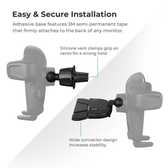 Available in two installation modes, the Easy One Touch 2 Wireless Mount can be securely installed on an air vent or in a CD slot. An included support foot can be adjusted via a button, allowing it to be lowered to help fit large and extra-large devices with screens up to 6.7” in size.