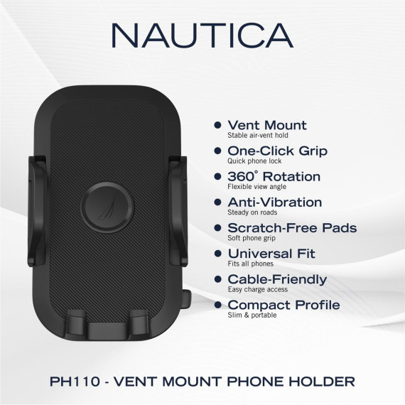 The Nautica PH110 Universal Car Vent Phone Holder is designed for drivers who value both style and functionality. Built exclusively for air vent mounting, it provides a stable and secure hold while keeping your phone within easy reach. The 360-degree rotation allows you to adjust your phone to the perfect viewing angle, whether for navigation, calls, or music. With one-hand operation and a vibration-resistant build, your device stays safe and steady even on bumpy roads. The sleek design complements any car interior, while the soft rubber padding protects your phone from scratches.