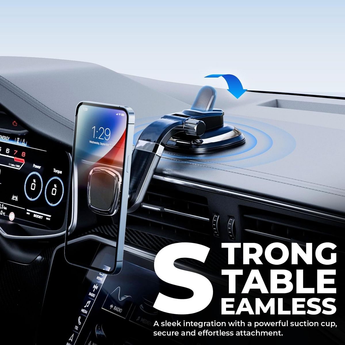 UPGRADED SUCTION CUP - Upgraded super strong stickiness suction cup. fits all dashboards with smooth surfaces, leather/faux dashboards. It is very easy to install with the unique suction cup (Less than a minute!), just make sure to remove all air from underneath before locking the lever.
