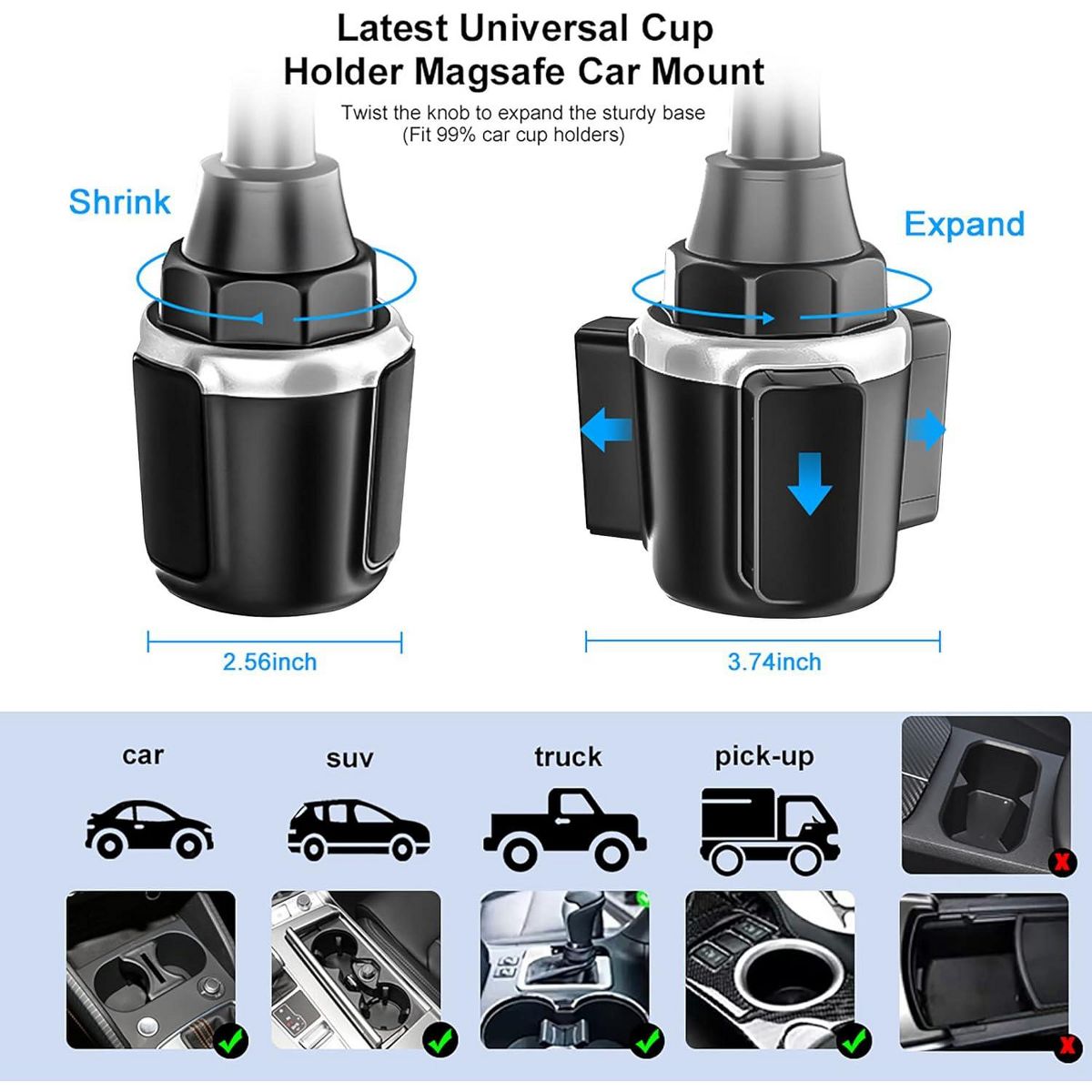UNIVERSAL COMPATIBILITY - Although the phone mount cup holder is designed specifically for MagSafe products, we added to universal magnetic rings to support non-MagSafe SmartPhone which is compatible with Samsung, Android, Google Pixel, and more. Whether you have a small or large device, it fits them all with ease.