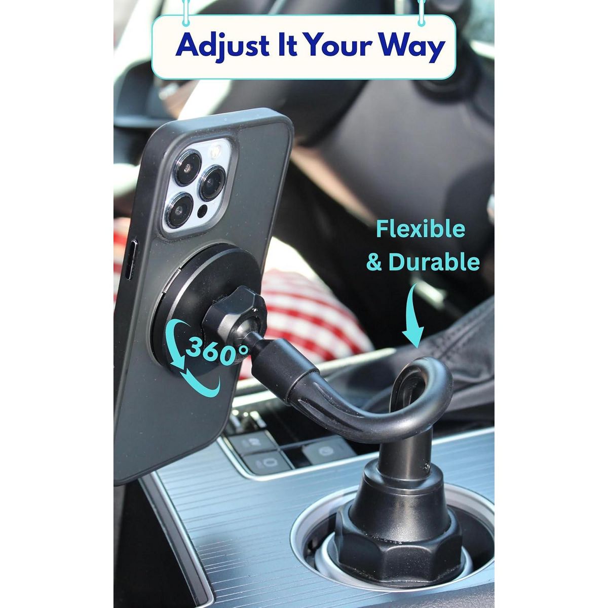 STURDY & FLEXIBLE DESIGN – Our phone holder cup holder mount is built from aircraft-grade aluminum and premium materials. The reinforced gooseneck connects solidly to the base to stay steady on rough roads while giving you full freedom to bend, twist, and rotate your phone to any angle you like.