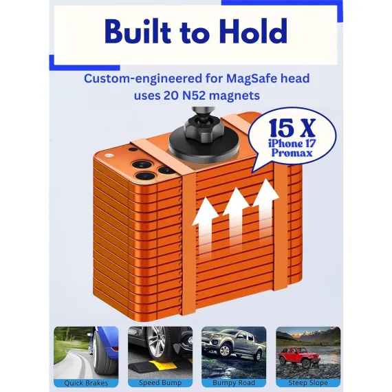 EXPERIENCE UNMATCHED MAGNETIC STRENGTH - Custom-engineered with 20-PCS N52 magnets, this cup holder phone mount keeps your phone locked in place, even on bumpy roads or off-road trips. The magnet is so strong it can hold up to 12 times the weight of an iPhone Pro Max, so your phone stays safe and steady no matter where you drive.