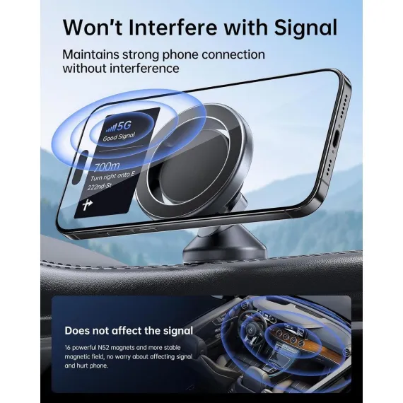 【Optimal Magnetic Balance】Equipped with N52-grade neodymium magnets, the MagSafe car phone mount provides an extremely strong magnetic hold, ensuring your phone stays securely attached, even on bumpy roads. Compatible with all MagSafe-enabled devices and MagSafe-compatible cases, it provides stability without compromising on ease of use. For non-magnetic case, just stick the metal ring provided outside the case. (NOTE: This car mount is designed solely for holding phones; no charging function.)
