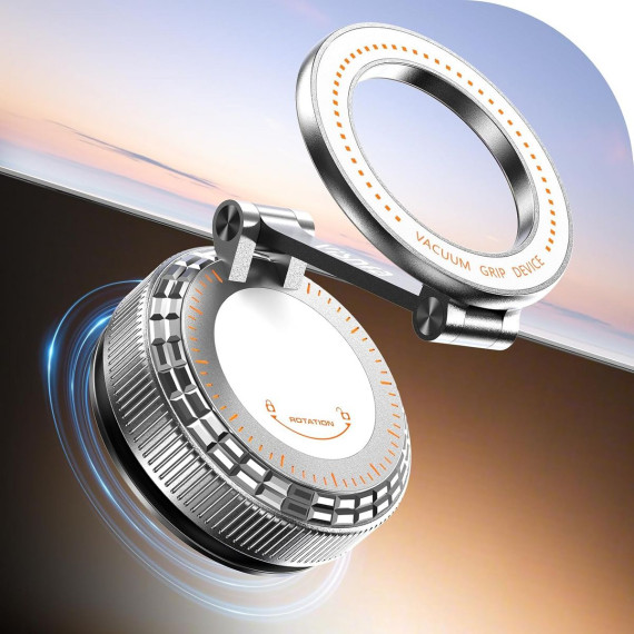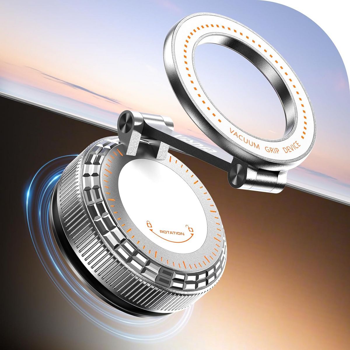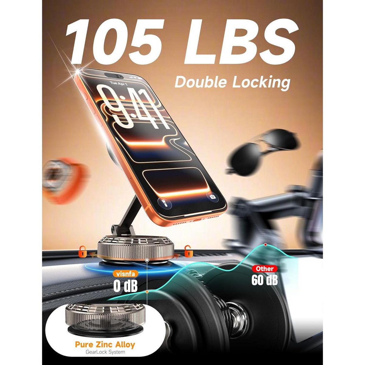 Super-strong magnetism, ultimate stability: The vacuum magnetic phone holder features a built-in upgraded N56 neodymium magnet with a powerful magnetic force of 3800GF. It can safely hold devices as heavy as the iPhone 17 Pro Max. The car phone holder mount utilizes a gear structure and top-tier structural strength made of 100% zinc alloy, making it fully capable of handling all kinds of challenging road conditions and weather. The more you shake it while driving, the stronger the attraction becomes. Furthermore, it causes zero interference to phone/GPS signals