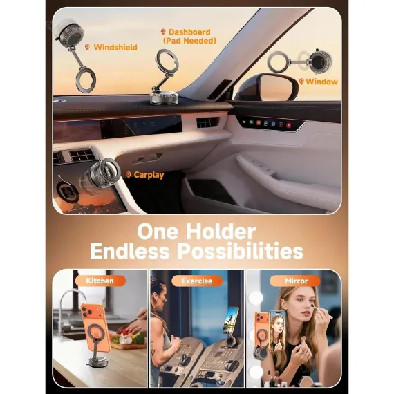 Multi-scenario, ubiquitous use: This dashboard phone holder features a powerful suction that extends its use beyond the car, adapting seamlessly to various scenarios in daily life. Whether for driving navigation, home workouts, following recipes in the kitchen, applying makeup in front of the mirror, using it on a boat, as a bedside table and desk mount, or even using it in the shower—take it anywhere, attach it, and instantly free your hands. Use this portable, foldable magnetic phone mount anywhere for hands-free shooting. It is perfect for TikTok, YouTube, and Instagram creators who need reliable hands-free shooting