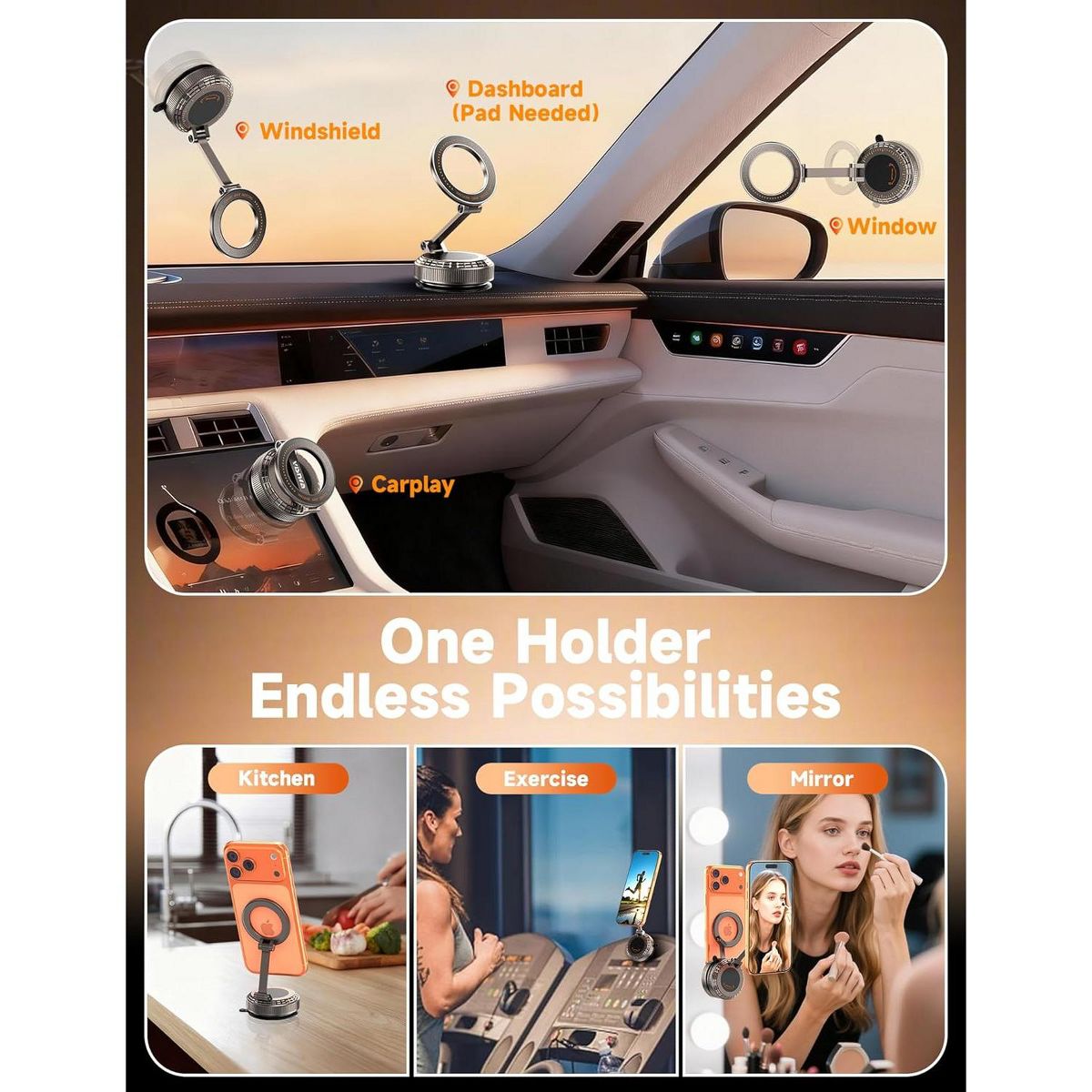 Multi-scenario, ubiquitous use: This dashboard phone holder features a powerful suction that extends its use beyond the car, adapting seamlessly to various scenarios in daily life. Whether for driving navigation, home workouts, following recipes in the kitchen, applying makeup in front of the mirror, using it on a boat, as a bedside table and desk mount, or even using it in the shower—take it anywhere, attach it, and instantly free your hands. Use this portable, foldable magnetic phone mount anywhere for hands-free shooting. It is perfect for TikTok, YouTube, and Instagram creators who need reliable hands-free shooting