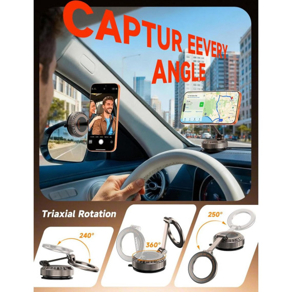 Super-strong magnetism, ultimate stability: The vacuum magnetic phone holder features a built-in upgraded N56 neodymium magnet with a powerful magnetic force of 3800GF. It can safely hold devices as heavy as the iPhone 17 Pro Max. The car phone holder mount utilizes a gear structure and top-tier structural strength made of 100% zinc alloy, making it fully capable of handling all kinds of challenging road conditions and weather. The more you shake it while driving, the stronger the attraction becomes. Furthermore, it causes zero interference to phone/GPS signals