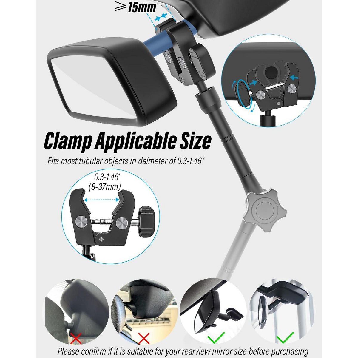 【Compatibility Instructions】Before purchasing, please confirm the size of your rearview mirror connecting rod! As long as your rear-view mirror connecting rod is more than 15 mm long and between 8 mm and 37 mm in diameter, our on-board rear-view mirror phone stand can be securely mounted on your car's rear-view mirror.