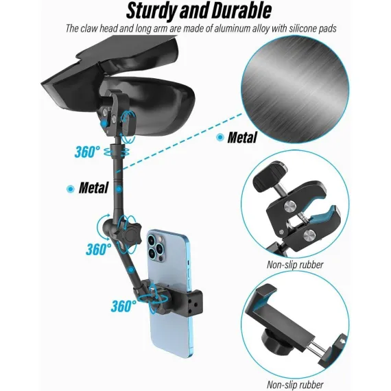 【Easy Clamping】Our rearview mirror phone holder for car design is as efficient as crab claws, super grip, no complicated setup required. Simply attach it to the rearview mirror using an adjustable clamp, with a silicone pad protecting the rearview mirror and preventing compression of the wiring harness.