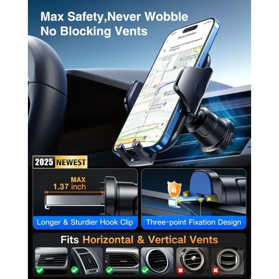 【 - 】Engineered from premium German PC2805 material, car vent clip offers exceptional durability and stability, far surpassing standard ABS plastic. Its Three-point fixation design securely grips your car's air outlet blades, keeping your phone stable on bumpy roads. With an upgraded hook length of 1.37 inches, it fits 99% of vertical and horizontal vents. The soft silicone pad on the clips back protects your vent blades from scratches and damage