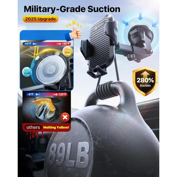 TEMI Military-Grade Car Phone Holder: 89lbs Suction, Easy Clamp Mount for Dashboard, Windshield Black