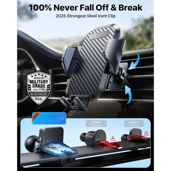 【Industry NO.1 Military-Grade Stability】Authorized by the international Military Standard with 50+ rigorous engineering tests of 89 lbs suction, 44°F --195°F temperature test, 10,000+ Opening and Closing tests, etc., its stability, security and durability perform NO.1 among all holder. By especially breaking the industry's record obtained international military-grade shockproof certification No. GZMR220601855501, Hold your phone firmly on any rough roads.