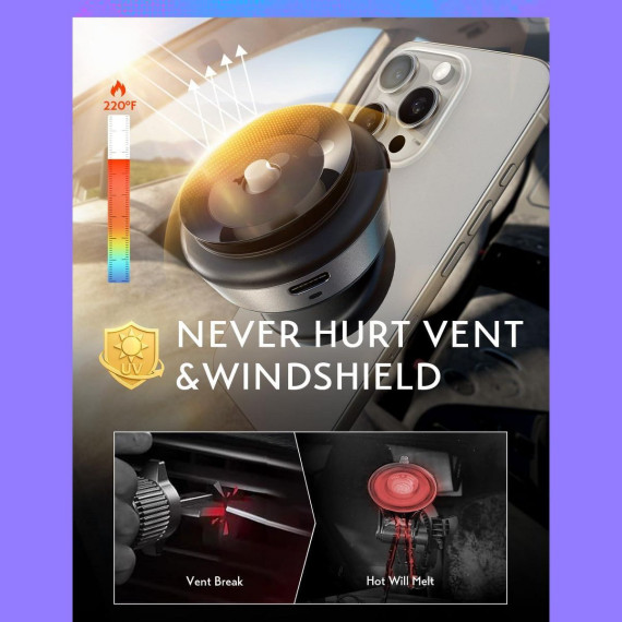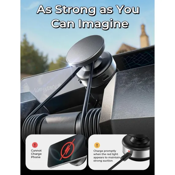 [Warm Tips]①The vacuum suction phone holder . ②Not suitable for leather surfaces. ③When you see the red light on the side, please pay attention to charging. Once fully charged, iphone suction mount can be used for approximately a month.Battery drains faster with frequent phone holder moves. ④The product is not waterproof.