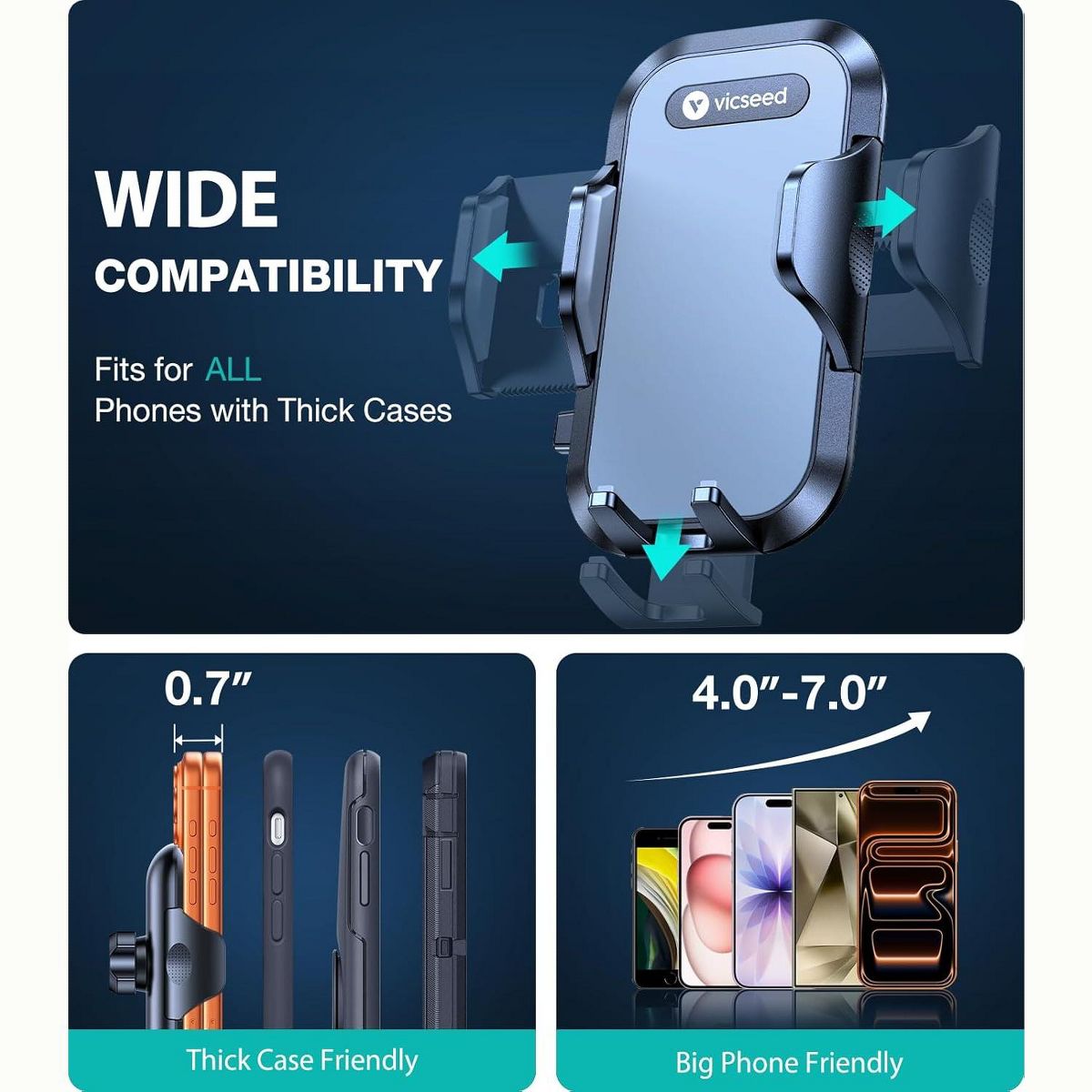 [Wide Compatibility, Big Phones Thick Cases Friendly] Upgraded extra deeper and wider adjustable clip arm of VICSEED car phone holder mount accommodates larger and thicker phones. Fits well for all mobile phones between 4''-7''(only except for samsung Fold/Z Flip series) and most thick case(only except for ring holder case and pop case).