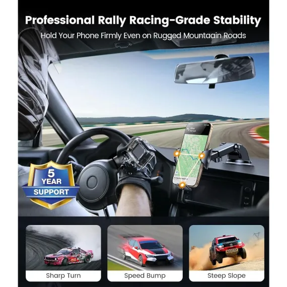 [Professional Rally Racing-Grade Stability] Even professional racers are amazed by its stability, because of its strong stability, this car mount has become the WRPG (World Rally Grand Prix) only designated product. this car cell phone holder owns the thick arms built-in anti-slip rubber pads, and full upgraded powerful suction cup, even you hit a bump or a sharper turn car phone holder and your phone will stay in a place.