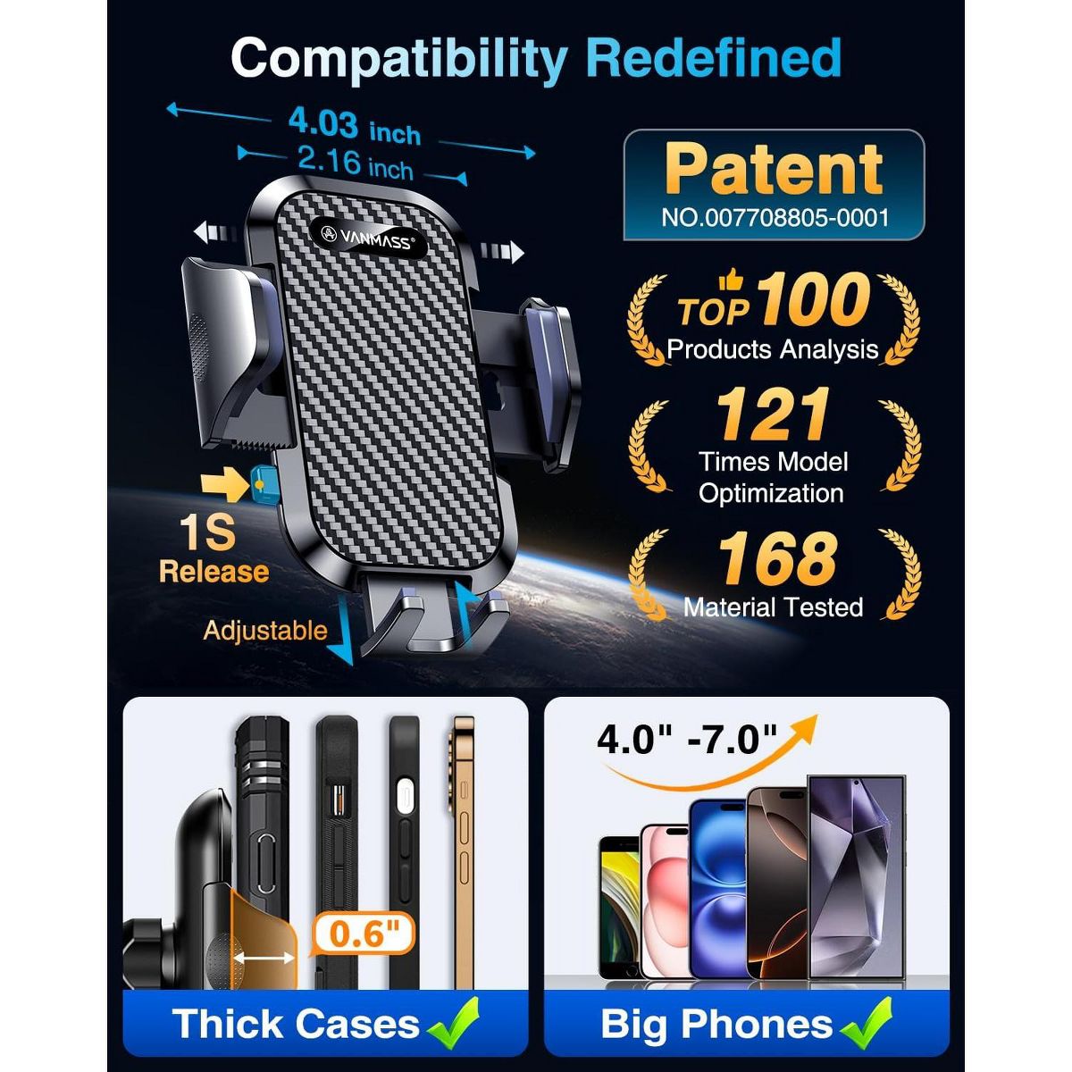 【 & , - 】① 0"-0.78" adjustable feet: wider and deeper for all 4"-7" phones, outperform traditional fixed-foot phone stands for car. ② Military-grade shockproof silicone panel on phone holder's feet and the innovative air capsule silicone (soft & highly elastic) inside the arm clamps provide full smartphone protection: increasing friction, and no-sliding. ③ The unique non-slip fingerprint texture on the side clamps ensures the fastest & tightest grip