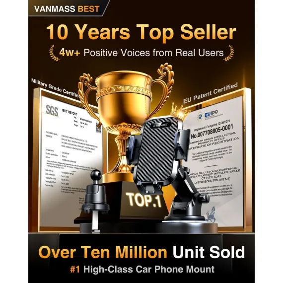 【True Military-Grade, Version 6.0 BEST Ultimate Model】The leader in high-end car phone holders. Rigorously tested to meet MILITARY GRADE standards - reliability, stability, integrity, longevity, security, durability. Overcome all weaknesses to design the version 6.0 Ultimate holder with international military-grade shockproof certification No. GZMR220601855501. This VANMASS car phone holder obtained CP65 / REACH / RoHS safety certifications