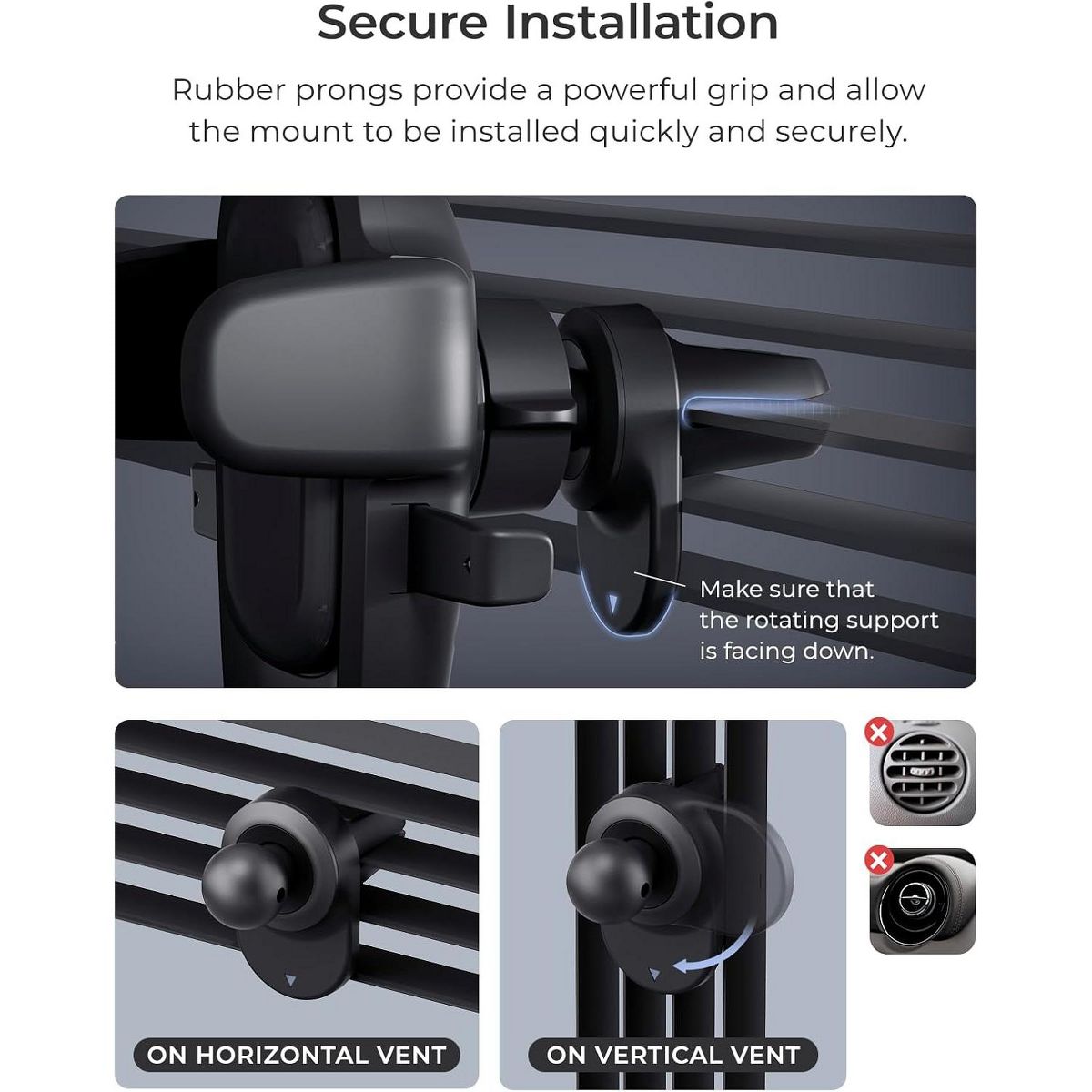 Quick and Secure Installation: Installs in seconds on both horizontal and vertical vehicle air vent blades via rubber prongs that provide a vise-like grip. Additional support foot prevents the mount from drooping even when holding larger, heavier phones.