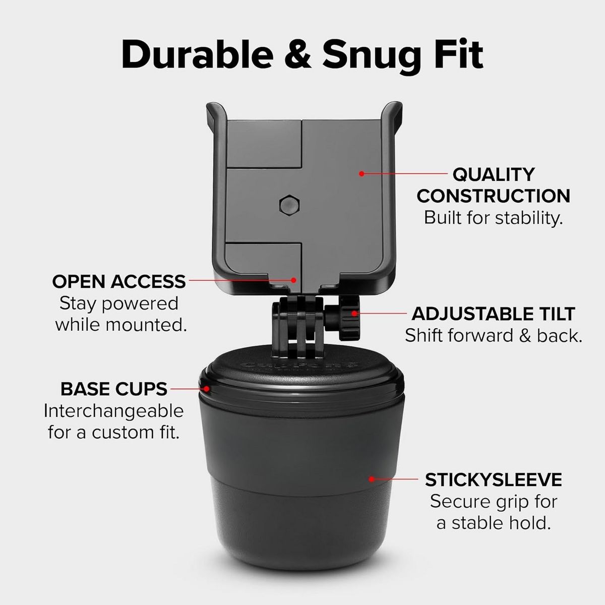 DURABLE & SECURE: Crafted from high-quality materials and built for stability, WeatherTech CupFone phone holder helps keep your phone steady on rough roads. The sturdy construction of this cup phone holder ensures long-lasting durability for years to come. An included rubber StickySleeve can be wrapped around the base, providing a snug and secure fit that helps prevent movement while you drive.