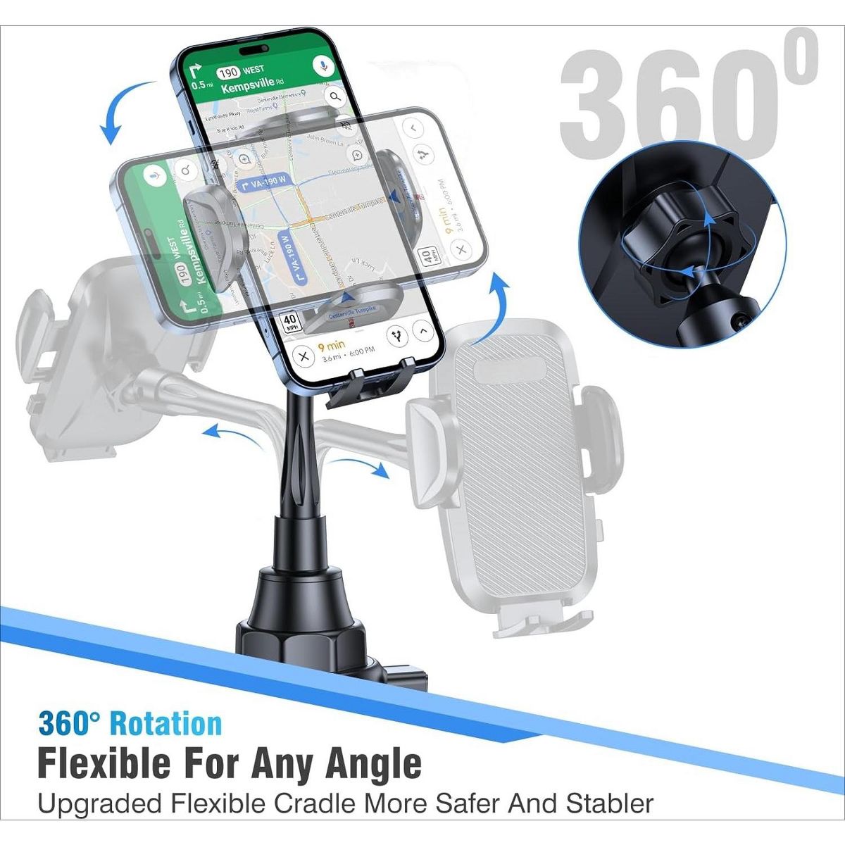 Strong & Sturdy: With the upgraded latest durable and sturdy bendable gooseneck design, car cup holder phone mount will provide extreme stability while driving on the bumpiest roads. The deeper clamp arms and soft holding feet provide 360° protection for your phone; Triangle-structure support will hold firmly your phone without concern for your phone moving when you speed up or make a sharp turn.