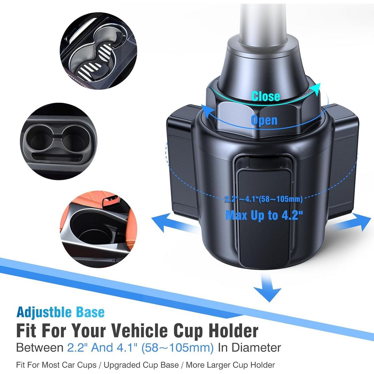Upgraded Expandable Base and Release Easily: cup holder phone mount base can be adjusted from Min.2.3" to Max.4.2", fits most car cup holder,no need extra tools, you can get three packs of silicon slice for the base extension support to fit larger cup holder. Featuring one-button release curved arm and extendable feet,It ensures safe driving whether you are talking, navigating, listening to music or charging.