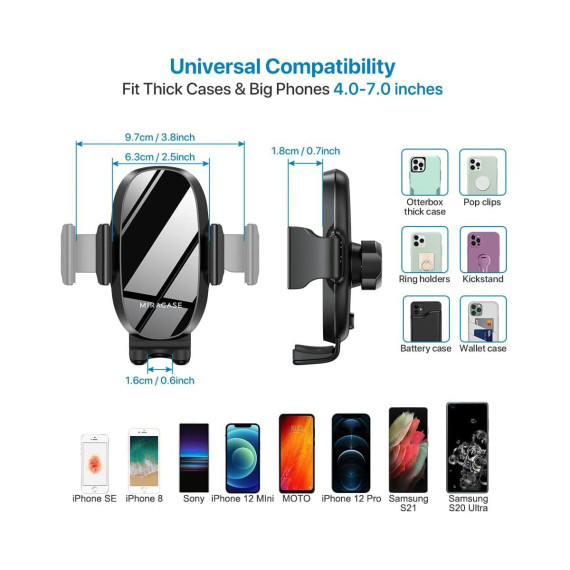 Big Phones & Thick Cases Friendly: Super wide adjustable clamp arms enable Miracase car cup phone holder mount to fit for all cell phones(4.0-7.0 inches) and thick phone cases, such as compatible with iPhone 15/15 Plus/15 Pro/15 Pro Max/14/14 Plus/14 Pro/14 Pro Max/13/13 Pro/13 Pro Max/13 Mini/12/12 Pro/12 Pro Max/12 Mini/SE/11 Pro Max/11 Pro/11/XS MAX/XS/XR/X/8/8 Plus/7/7 Plus/ Samsung Galaxy Note20/S21/S21+/S20+/S20 Ultra/S10+/Sony, LG, Google Pixel and most mobile phones, GPS devices.