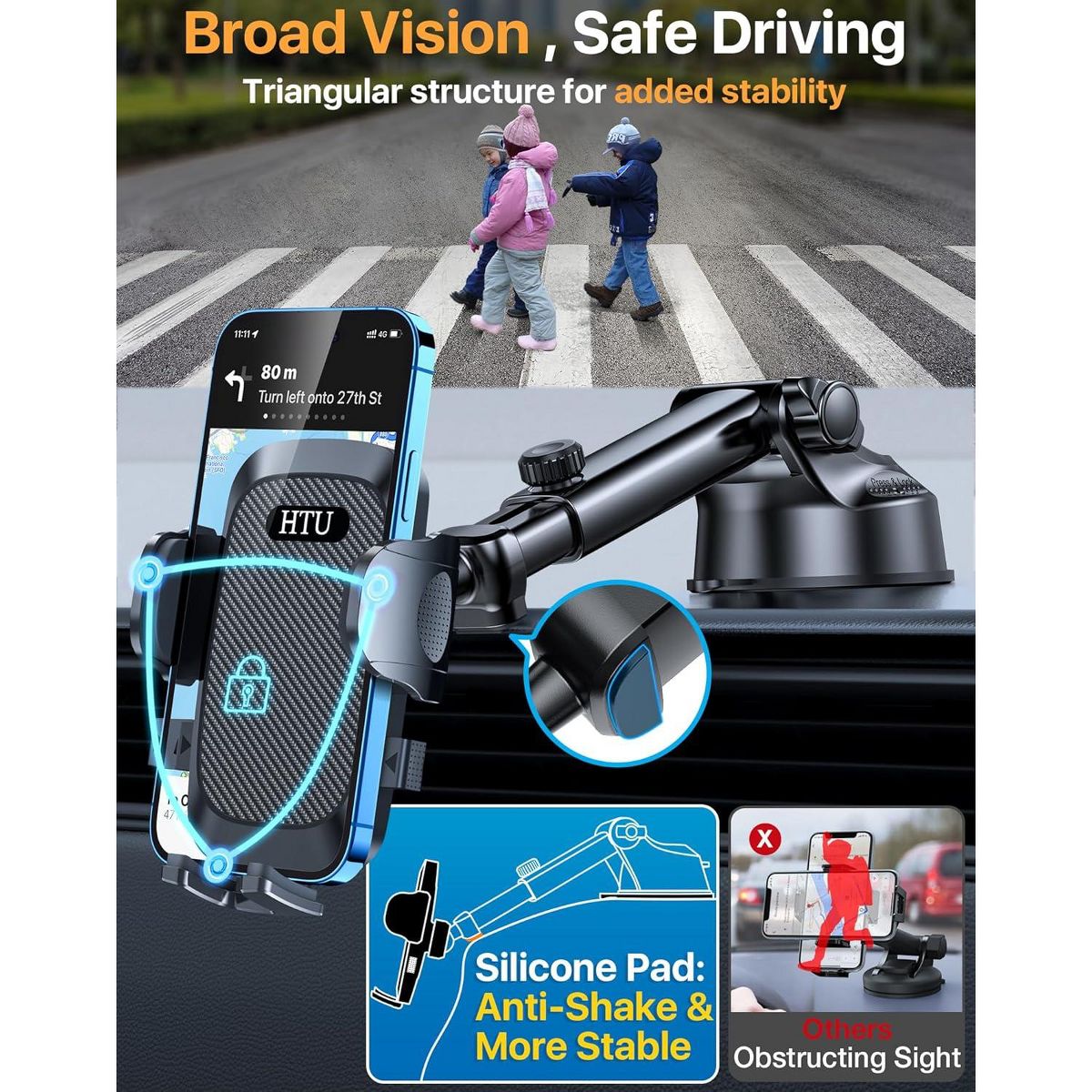 [EXTRA ACCESSORIES INCLUDED]: Our phone holder for car comes with extra accessories to provide you with the experience. The package includes 1 HTU Exclusive Cable Manager, 1Sturdy Air Vent Clip, 1Strong Suction Cup Mount, 1Adjustable Phone Holder, 1User Manual, and 1Beautiful Packaging Box. With our car holder for cell phone, you'll have everything you need for safe and convenient phone use in your car.