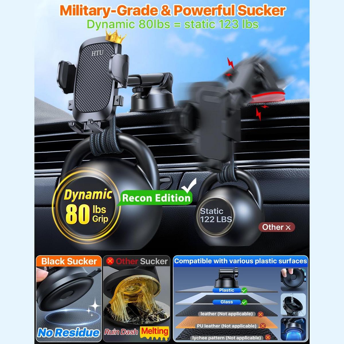 [MILITARY GRADE STURDINESS]: Our phone mount for car, also serving as a cell phone holder car, is the version ever based on feedback from over 8,000,000 customers. With the strong clamping force up to 80 lbs, it is 20 times sturdier than normal phone holders for your car. The extra strong suction cup with super sticky gel pad sticks tightly on your dashboard or most flat surfaces, making it the perfect phone holder for car.