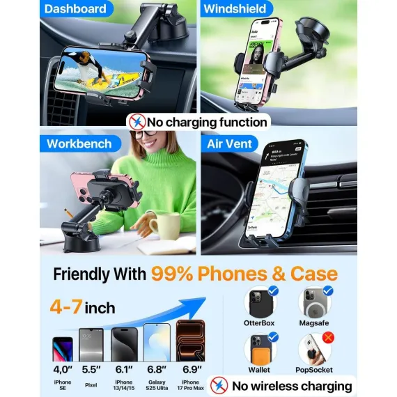 [THICK CASE FRIENDLY]: The phone holder for car is thick case friendly, compatible with most smartphones and thick cases, such as for iPhone 17/ iPhone 17 Pro /iPhone 17 Pro Max / iPhone Air/iPhone 16/16 Pro / iPhone 16 Pro Max/iPhone 15/15 Pro / iPhone 15 Pro Max/ iPhone 14/14 Pro / iPhone 14 Pro Max / iPhone 14 Mini / iPhone 13 Pro / iPhone 13 Pro Max / iPhone 13 / iPhone 13 Mini / iPhone 12 Mini / iPhone 12 Pro Max / iPhone 12 Pro / iPhone 12 / iPhone SE / 11 / Xs Max / XR / X / 8 / 8 Plus / 6 / 6S / 7 / 7 Plus, Samsung Galaxy Note 20 / S20 / 10 / S10 / S10 Plus / S10e / S9 / S9 Plus / S8 / S8 Plus, etc.