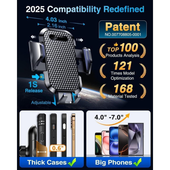 【Holder King: Sturdily Guard You Safe Driving】Focusing on customers' needs, we created the Pro Version car mount that is suitable for both cell phones & cases; and deepened the clamping arm to 0.6 inches to ensure a more stable support. The Pro Version car mount is suitable for all 4-7 inches cell phones & 99% of phone cases, compatible with iPhone16 Pro Max 15 14 13 12 X 8 7 Mini, Samsung Galaxy S22 S21 S20 Ultra Note 20 A71 A51 A50 A10, LG, Google Pixel, Xiaomi, Motorola, OnePlus