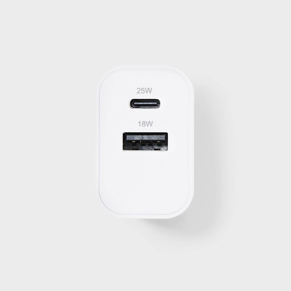 Charge two devices quickly and safely with the 2-Port 25W Wall Charger with 3' USB-C to USB-C Cable from dealworthy™ in White. Featuring short circuit protection and a charge indicator light for added safety, this charger is ideal for fast, efficient power. The pack includes a 3-foot USB-C to USB-C cord for immediate use and supports fast charging with a combined 25-watt output. Ideal for home or office, this charger meets all your on-the-go powering-up needs.