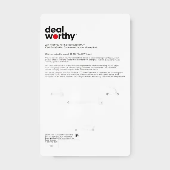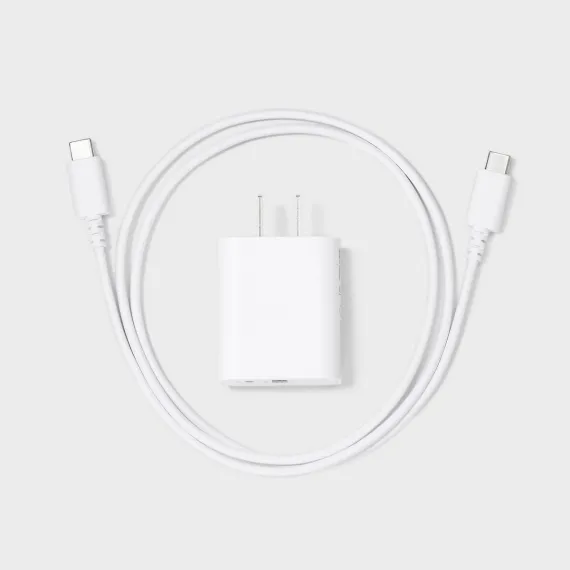 Charge two devices quickly and safely with the 2-Port 25W Wall Charger with 3' USB-C to USB-C Cable from dealworthy™ in White. Featuring short circuit protection and a charge indicator light for added safety, this charger is ideal for fast, efficient power. The pack includes a 3-foot USB-C to USB-C cord for immediate use and supports fast charging with a combined 25-watt output. Ideal for home or office, this charger meets all your on-the-go powering-up needs.