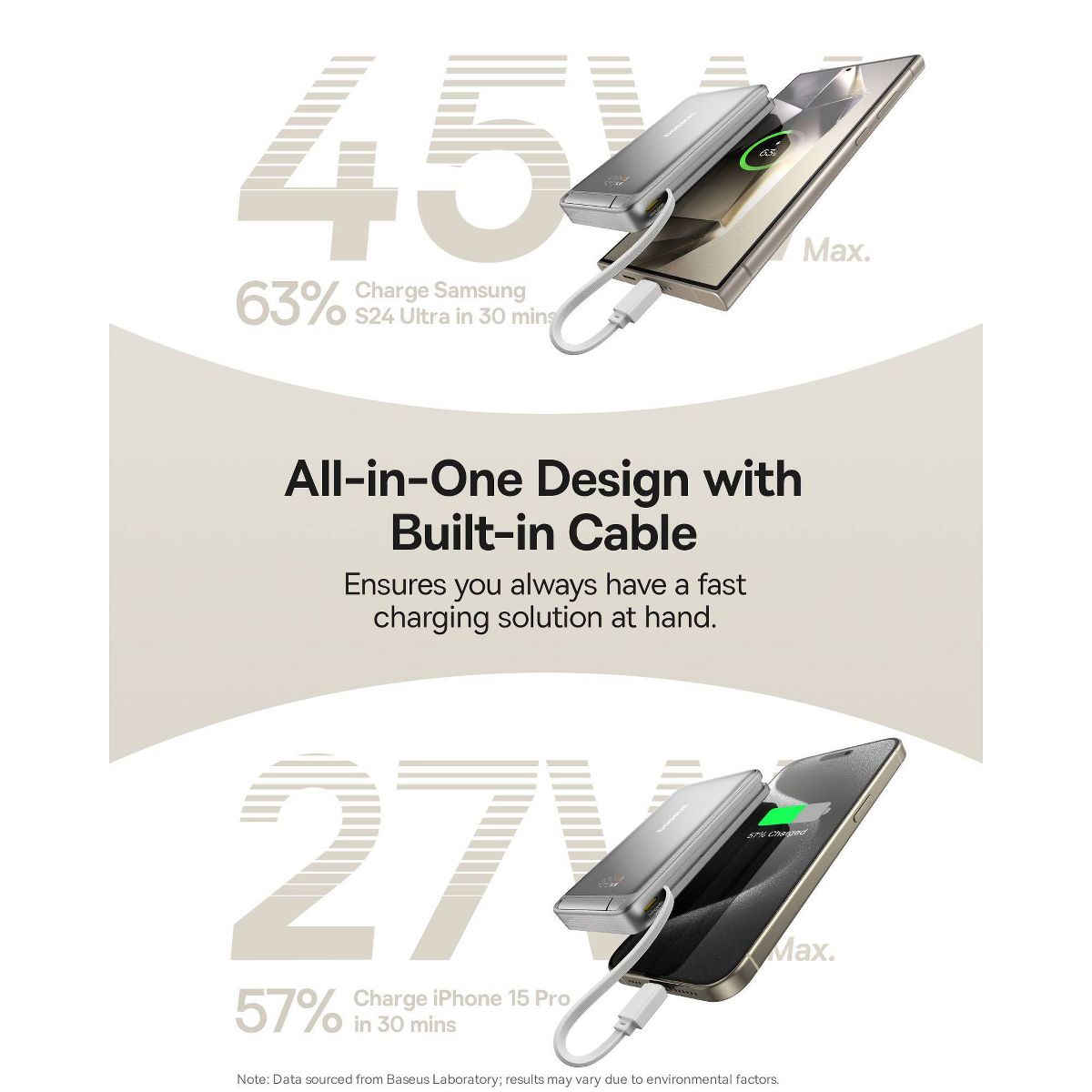Baseus 10000mAh Nomos Qi2 Magnetic Bracket Power Bank with Built-in USB-C Cable 45W - Gray: Compatible with Apple & Samsung Models