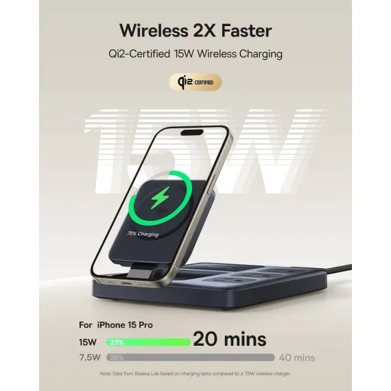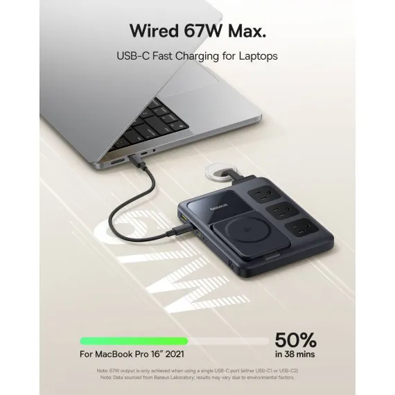 Enjoy flexible fast charging options with three versatile methods: AC charging, Qi2 magnetic wireless charging, and 67W USB-C fast charging. Whether you're at home, in the office, or on the go, you can choose the best method for your devices, ensuring they're powered up quickly and efficiently.