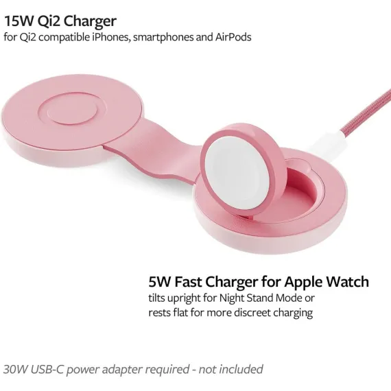 Charge your iPhone and Apple Watch together with ButterFly SE, the worlds smallest 2-in-1 USB-C Qi2 charger. Similar in size to an AirPods Pro Case, this ultracompact dual charger was designed with travel in mind. Unfold the colorful soft-touch pink, white or black outer shell to reveal a Qi2 charger for your iPhone and a magnetic fast charger for your Apple Watch. ButterFly SE also morphs into a display stand that supports StandBy mode on iPhone or Nightstand mode on Apple Watch.