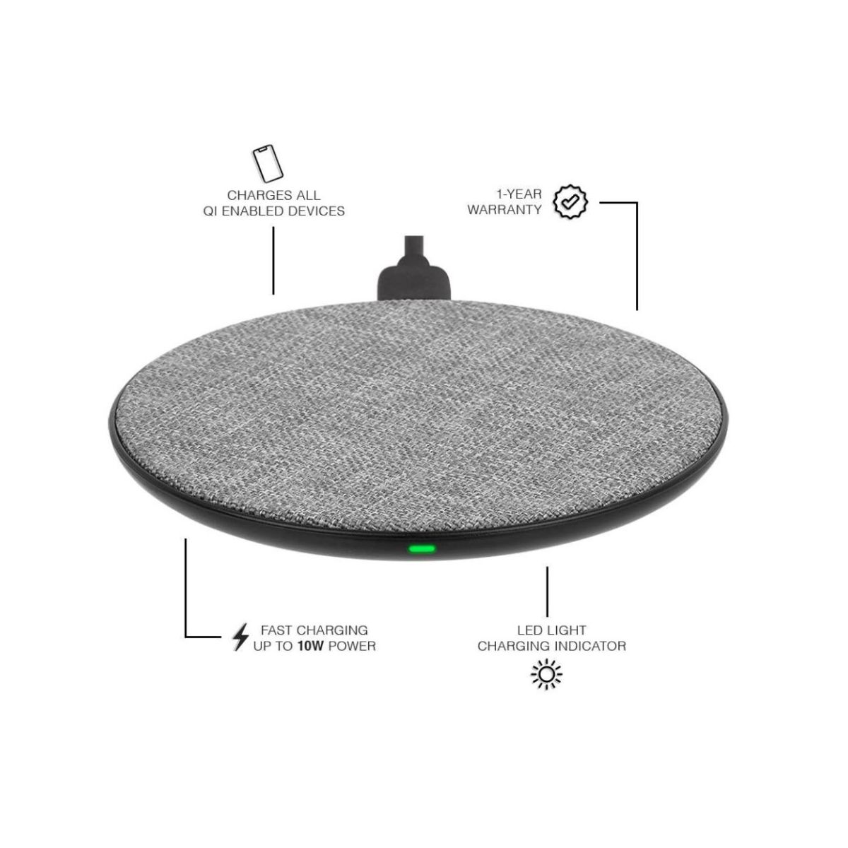 Say goodbye to tangled wires and lost charging cables! Easily replenish your phone’s battery with the compact Power Disk. Simply place your device on the disk and sit back as your device quickly charges with 7.5W charging speeds for Apple devices and 10W for Samsung devices. This charging disc has a one year warranty.
