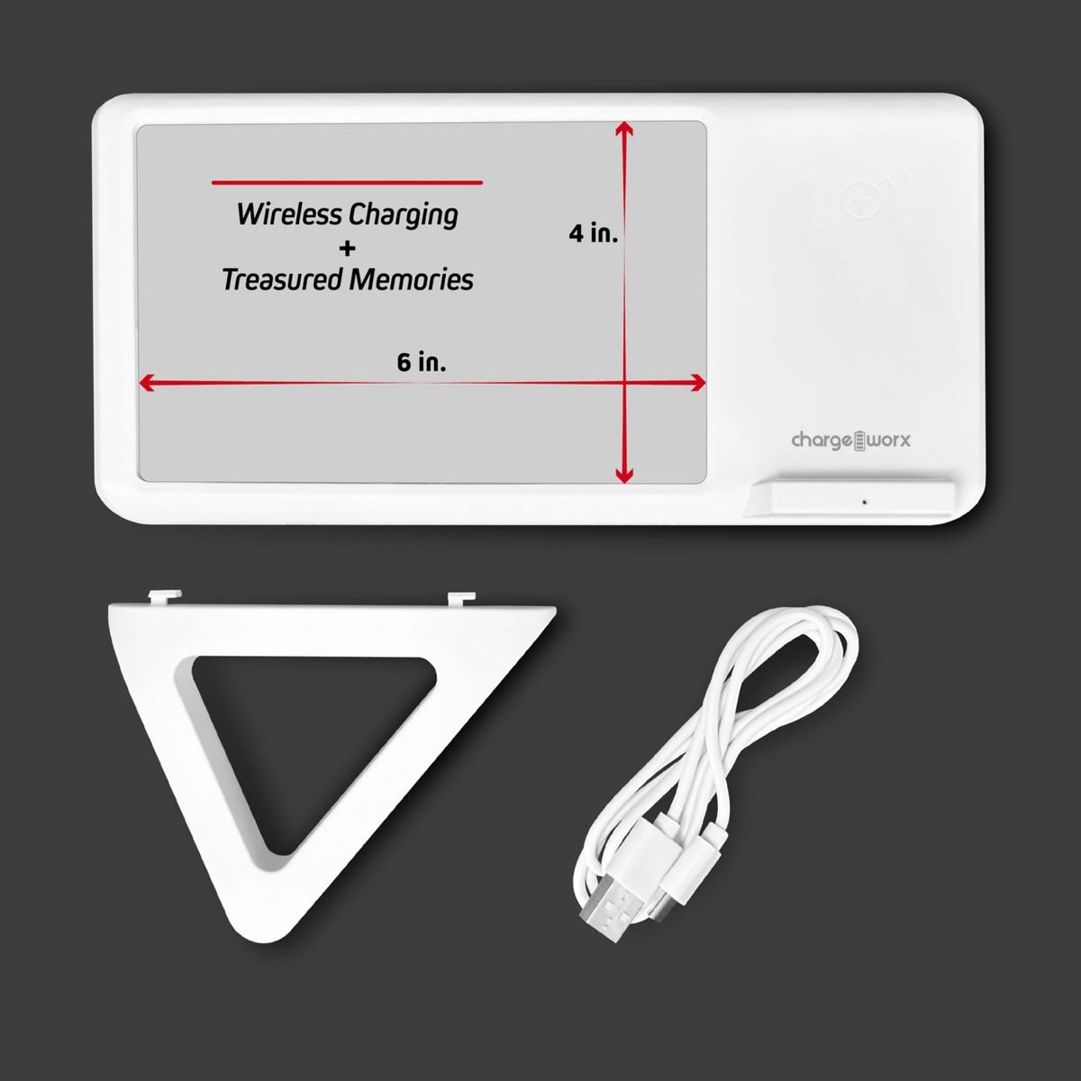 - Supports Photos 4' x 6': Make timeless memories last even longer with Chargeworx's Wireless Charging Stand. The photo frame's canvas supports any photo that is up to 4' by 6' big, making it an incredible accessory for nightstands, office desks, and even your living room table!