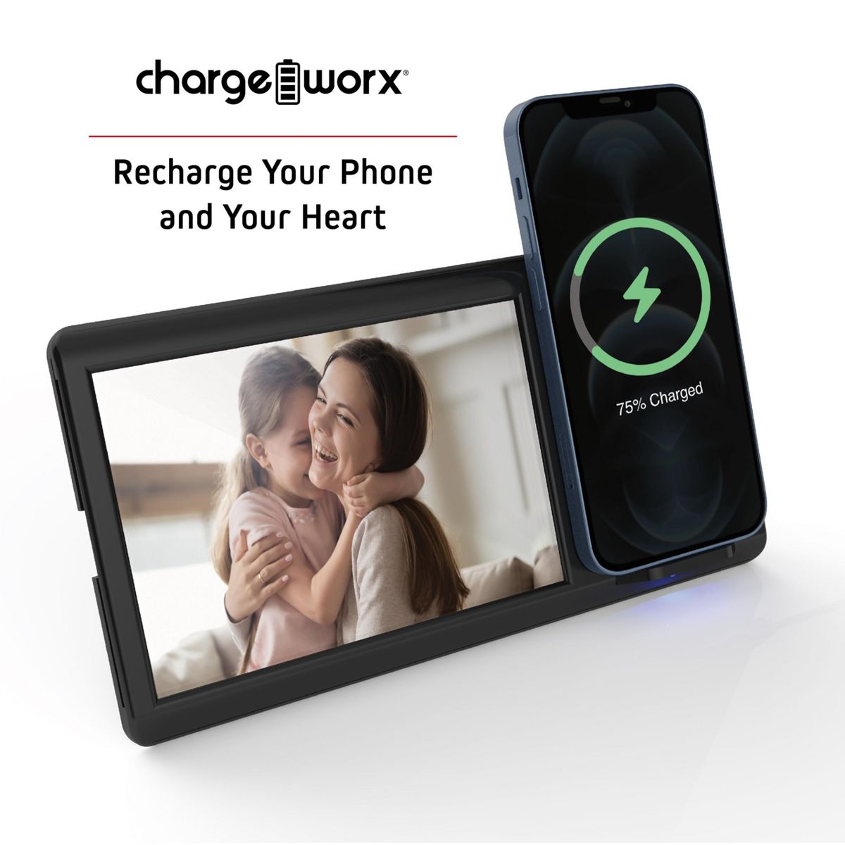 This is not a digital picture frame. Immerse yourself in a world of treasured memories with Chargeworx's Wireless-Charging Photo Frame. Designed to seamlessly blend functionality with elegance, this accessory revolutionizes the way you showcase your favorite moments. Featuring a sleek and minimalist design, the Wireless-Charging Photo Frame is the perfect addition to any living space, office, or bedside table. Crafted with precision and attention to detail, it effortlessly enhances your interior decor while preserving your cherished memories and offering a convenient wireless-charging solution for your smartphone. Designed to accommodate photos measuring 4" by 6", this photo frame offers the ideal canvas to display your most cherished snapshots! Whether it's a candid family portrait, a scenic vacation picture, or a memorable milestone achievement, this wireless-charging frame proudly showcases every detail, capturing the essence of your special moments. But what truly sets this photo frame apart is its wireless-charging capabilities. Gone are the days of messy cables and constant plugging and unplugging! With wireless-charging technology, you can effortlessly charge your smartphone device while keeping your most treasured memories on display. Indulge in the perfect harmony of technology and aesthetics with Chargeworx's Wireless-Charging Photo Frame. Elevate your space, effortlessly charge your devices, and proudly display your memories with this addition to your home or office.