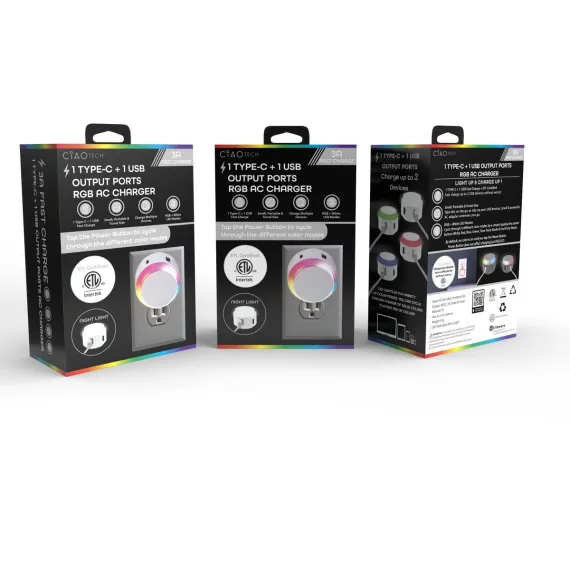 Ciao Tech 1 USB + 1 Type-C Port RGB Power Adapter Charger Brick