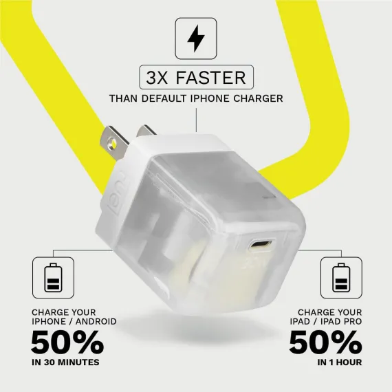 The FUEL 30W Output PD 3.0 Charger with USB-C interface offers fast, efficient charging in a sleek and colorful translucent design, adding style to your tech setup. Featuring a smart power regulator, it ensures optimal charging speeds while protecting your device. Sold individually without a cable, this charger delivers reliability and advanced functionality. With a 1-year warranty, it provides peace of mind for users who appreciate both performance and aesthetics. The FUEL charger is a perfect choice for anyone seeking modern, efficient charging with a vibrant flair.
