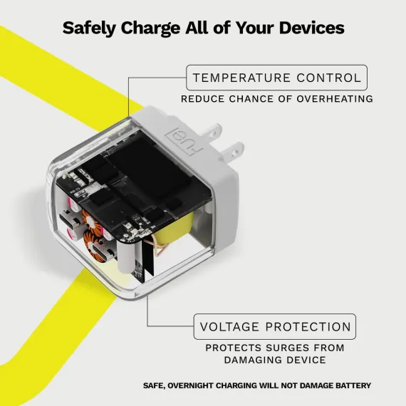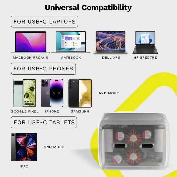 Step up your charging. This semi-transparent 50W Foldable Wall Charger includes two USB-C fast charging ports so you can power multiple devices at once. Smart Charging Technology (SCT) allows the charger to customize speeds based on the device you’re charging, giving you the maximum output allowed (up to 50W). This charger is compatible with Apple, Samsung and other smartphone brands and is perfect for the iPad Pro, iPad Air and any other USB-C compatible tablets. The 50W charger can also be used for the MacBook Pro 13” & 14”.