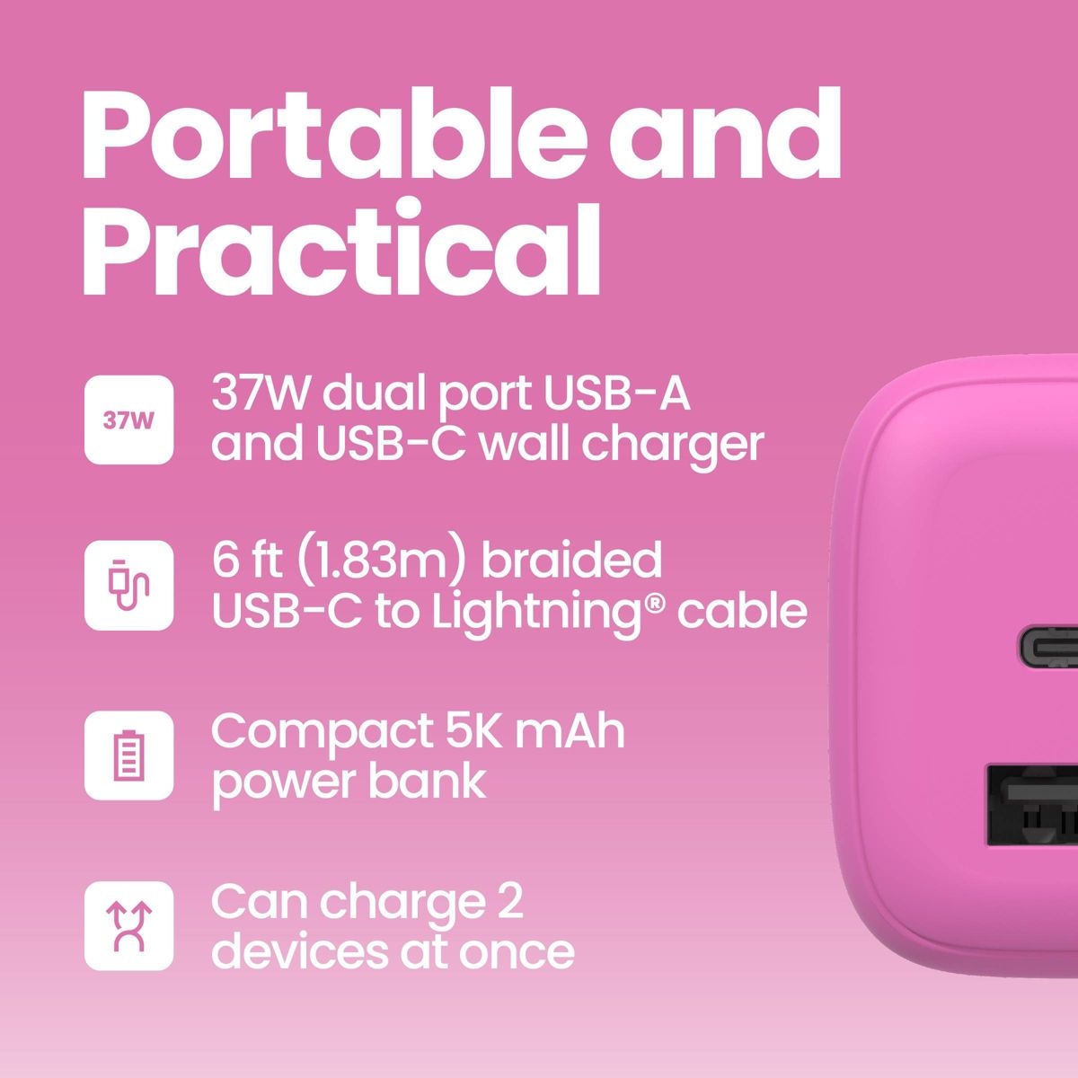 The GEMS USB-C to Lightning Charging Giftset keeps your favorite devices powered up no matter where your day takes you. This handy set includes a compact 5,000 mAh power bank that can charge two devices at once, a dual port wall charger for fast charging at home, and a durable 6ft braided cable that gives you extra reach and flexibility. The built-in battery indicator makes it easy to see when your power bank is ready to go. Whether you’re traveling or just need a reliable way to stay connected, the GEMS USB-C to Lightning Charging Giftset has everything you need in one simple bundle.
